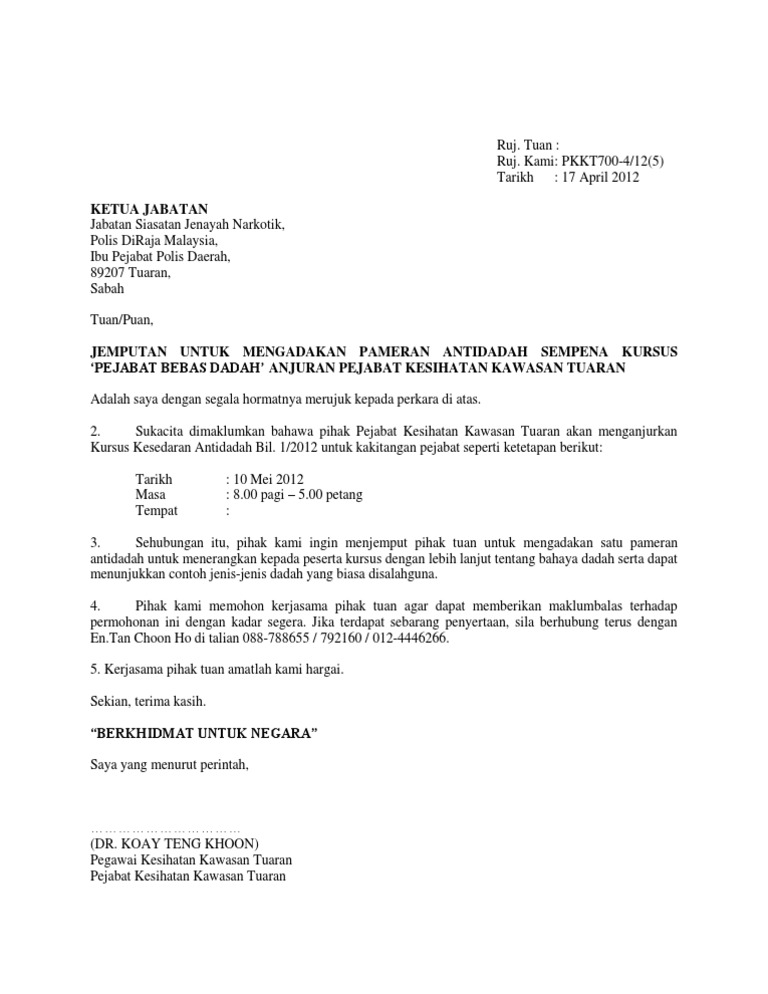 Semua aktiviti rentas negeri dan daerah tanpa kebenaran pihak Polis Diraja Malaysia PDRM di seluruh negara adalah tidak dibenarkan mulai 10 Mei sehingga 6 Jun 2021 umum Menteri Kanan Pertahanan Datuk Seri Ismail Sabri Yaakob. Sehingga kini seramai 208 orang pegawai Jabatan Kastam Diraja Malaysia telah menerima pentauliahan sebagai rakan pembimbing perkhidmatan awam atau AKRAB. Contoh Surat Rasmi Kepada Dbkl - Berikut adalah contoh surat rasmi kepada pihak sekolah jika ibubapa kepada murid atau pelajar tidak dapat atau enggan menghantar anak anak ke sekolah kerana situasi semasa covid 19.